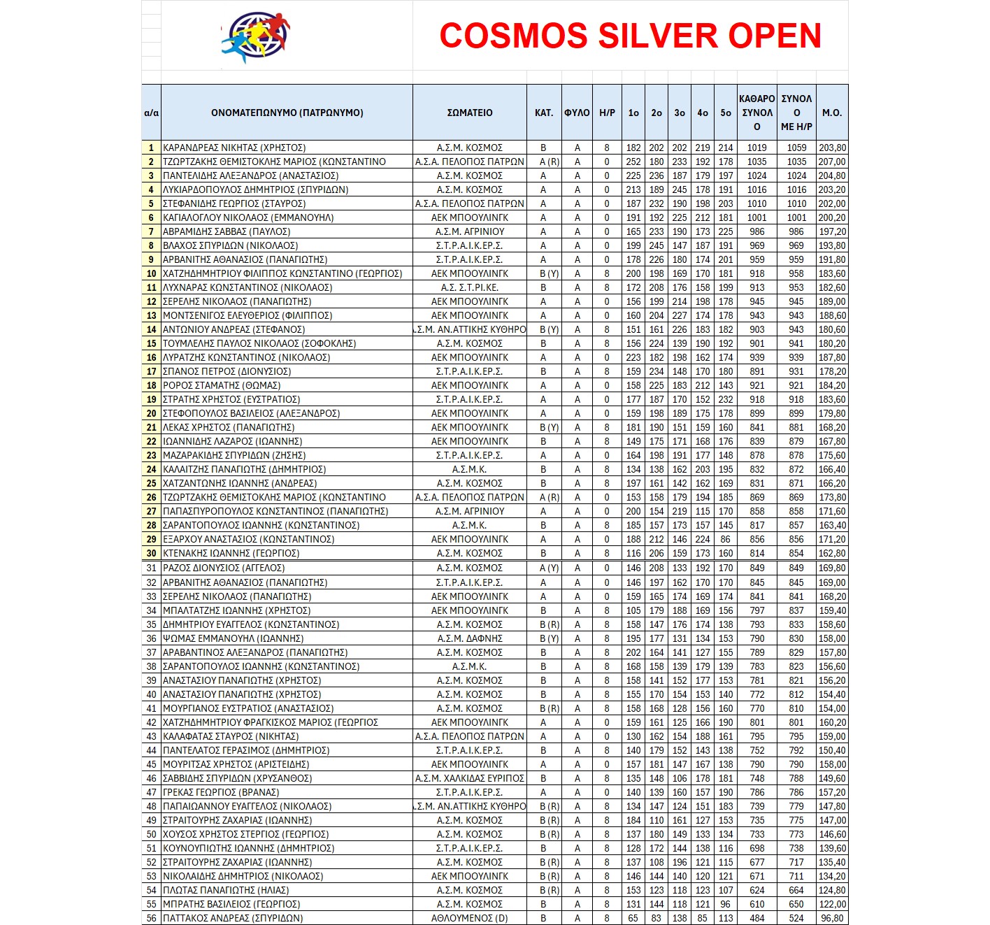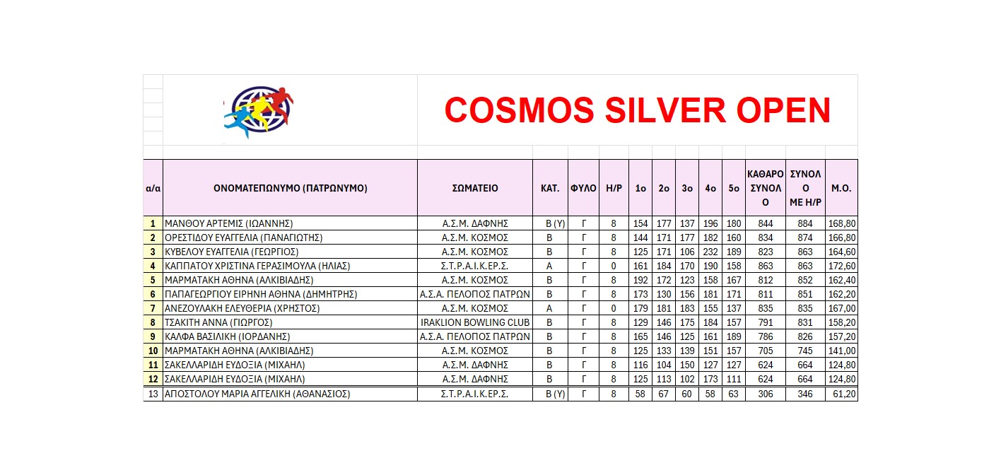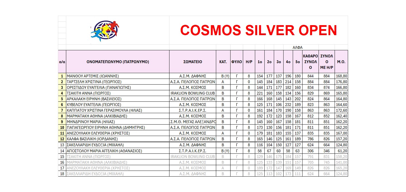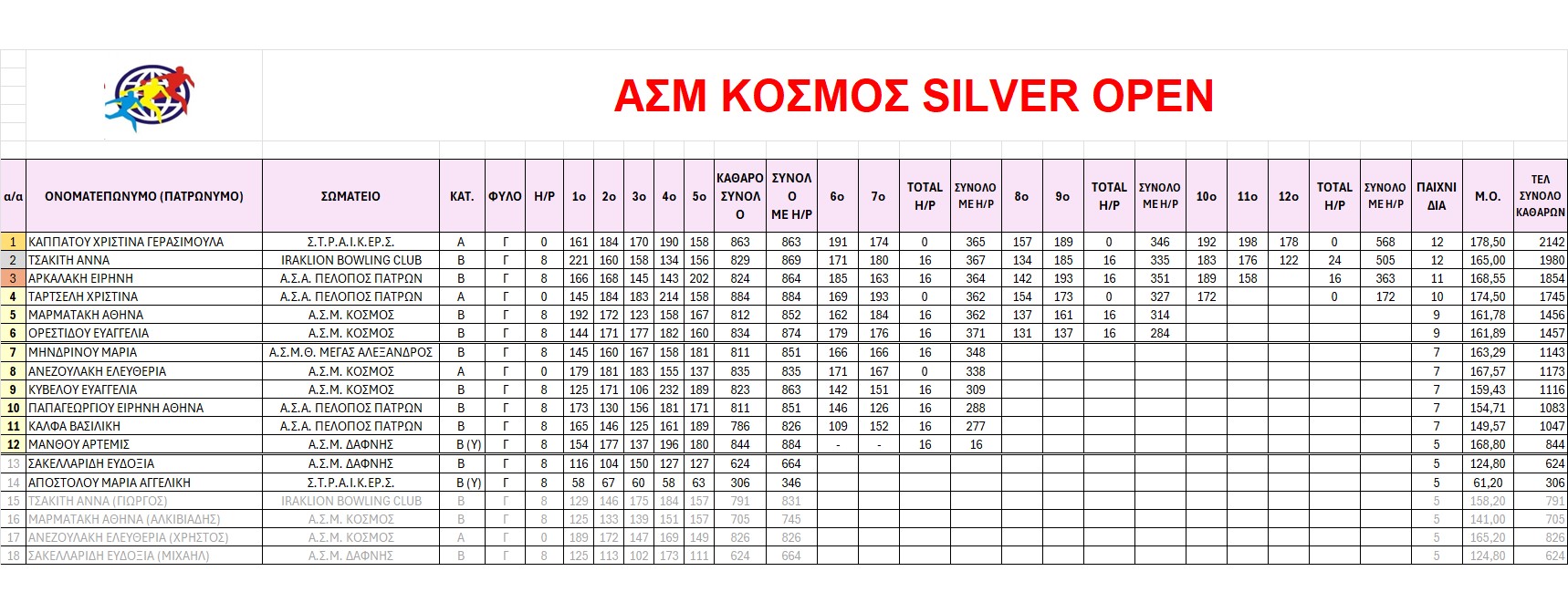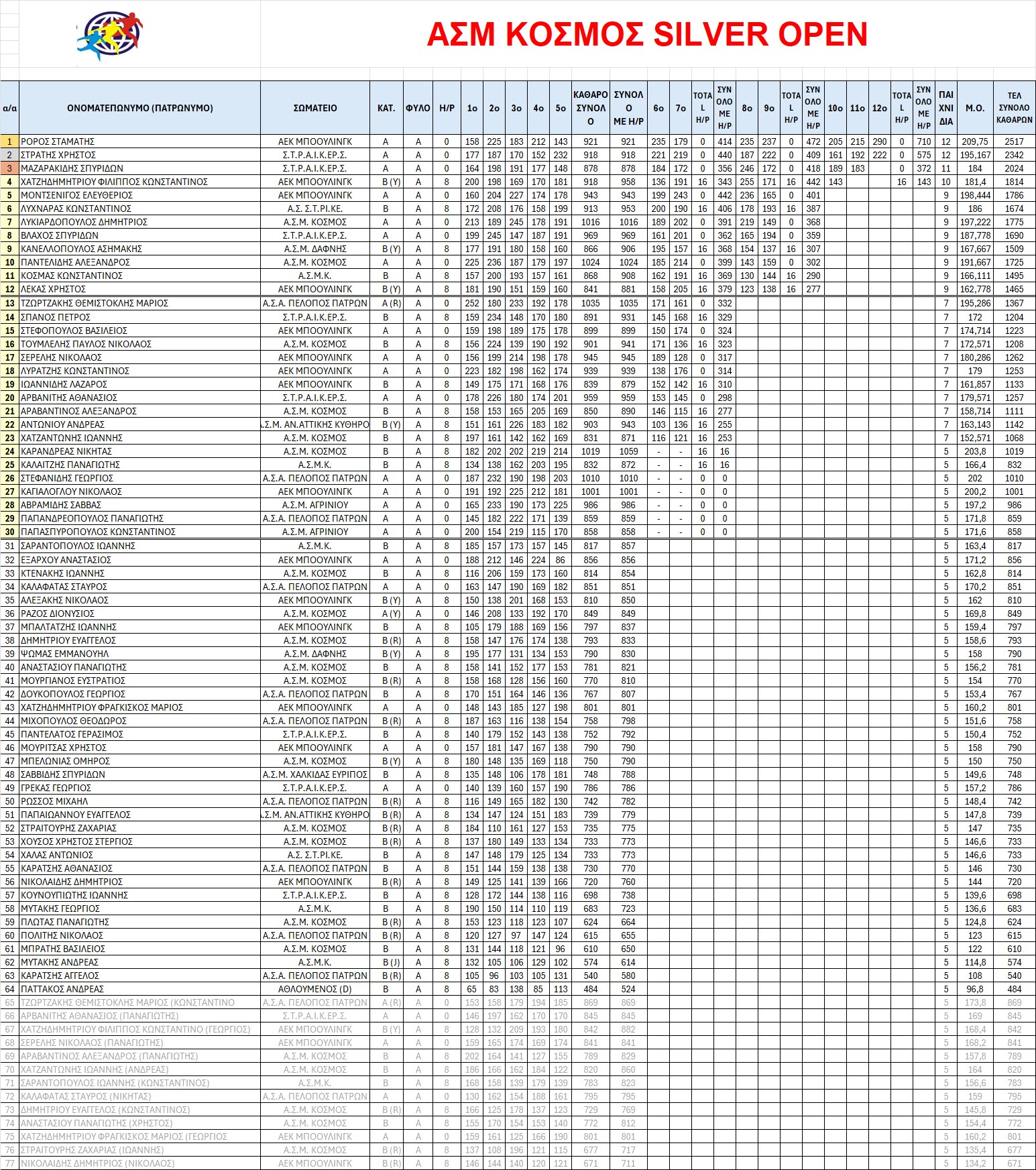Α.Σ.Μ Κόσμος Silver 4 Προκήρυξη Oil pattern Δηλώσεις Αποτελέσματα Group 1 Αθλητών Αθλητριών Group 2 Αθλητών Αθλητριών Group 3 Αθλητών Αθλητριών Group 4 Συνολικά Προκριματικά Αθλητών Αθλητριών Τελικά Αθλητών Τελικά Αθλητριών