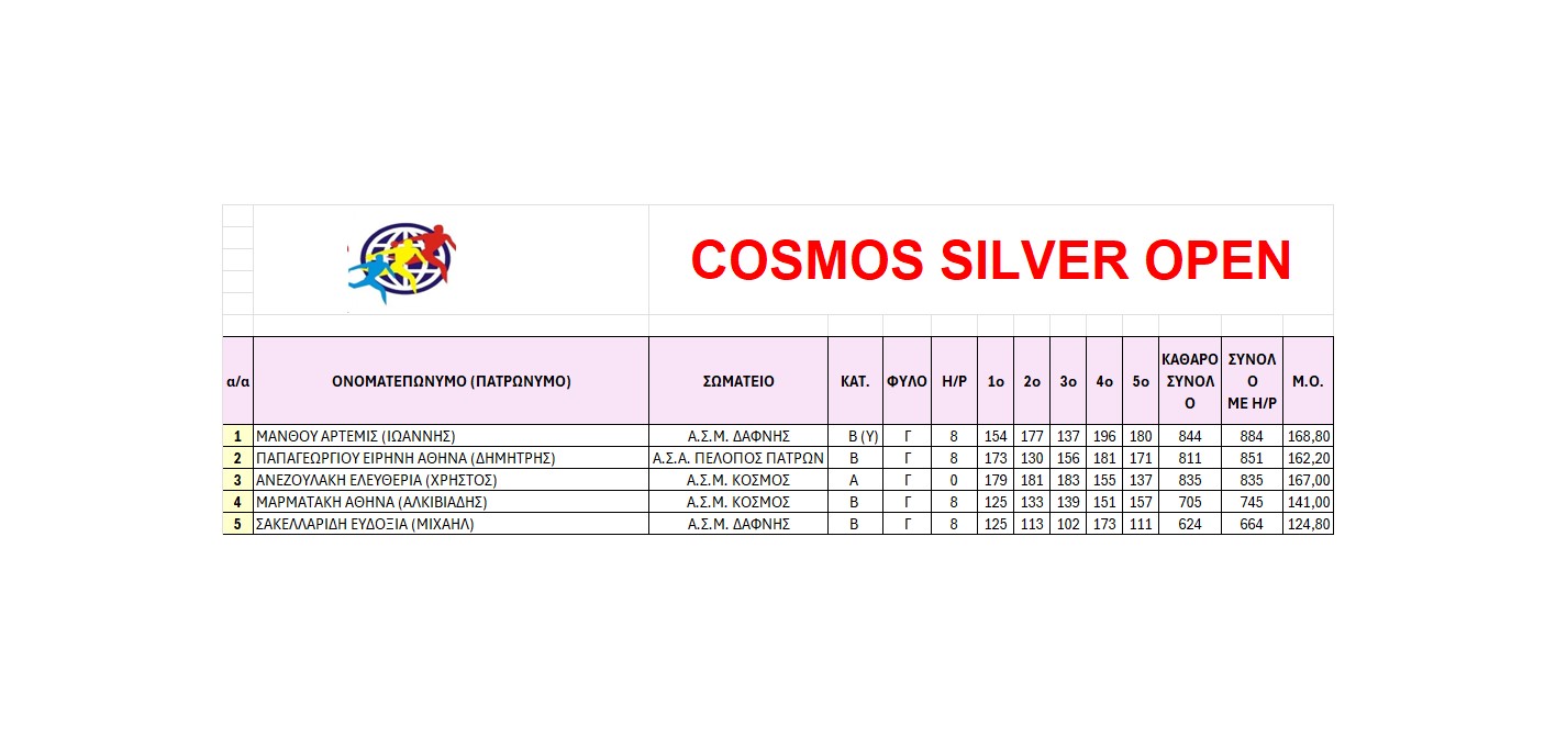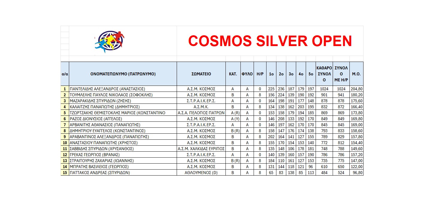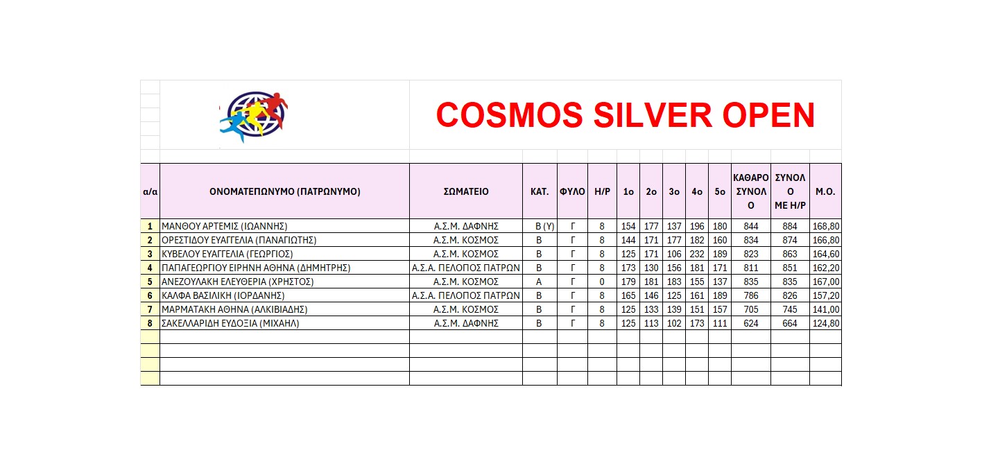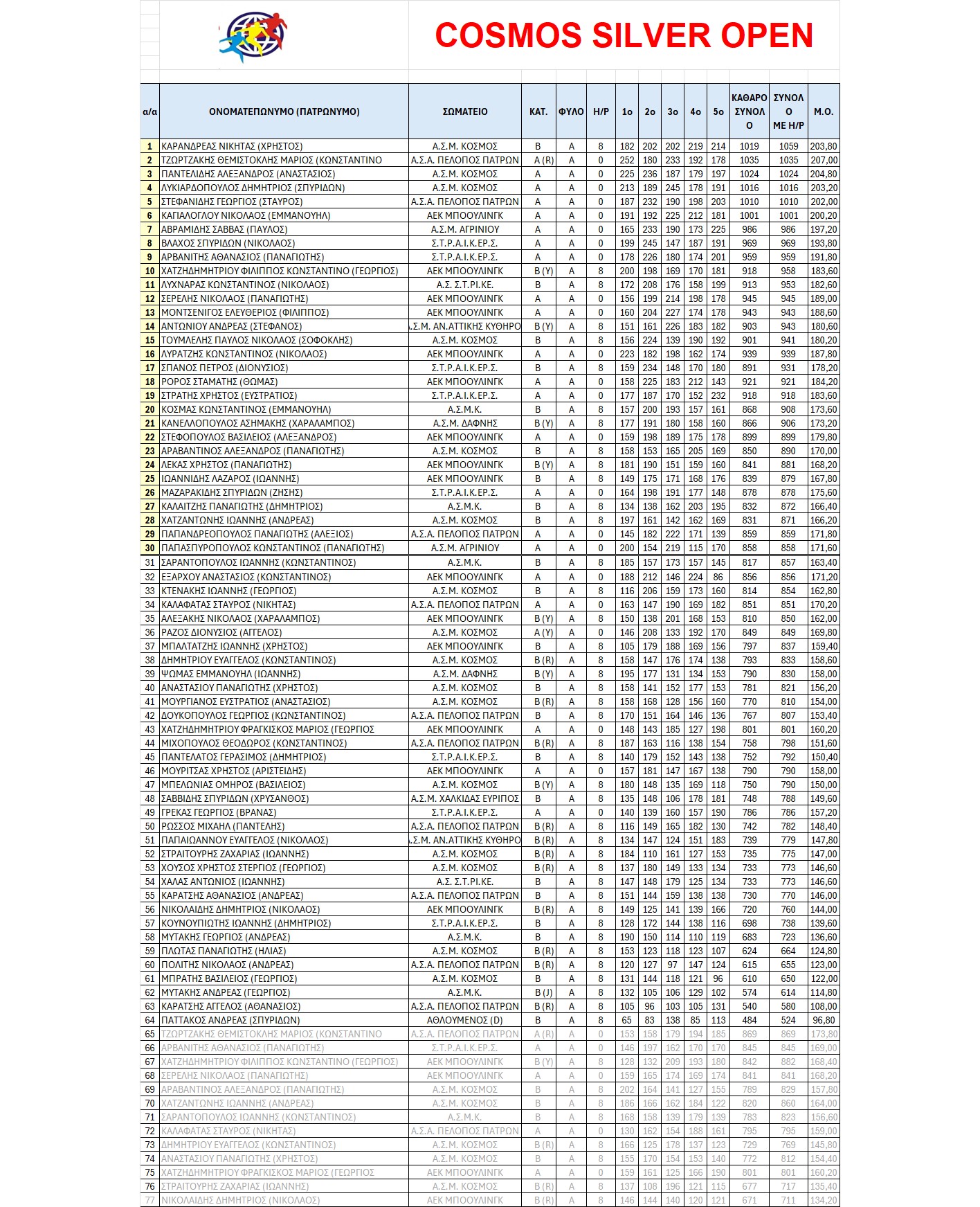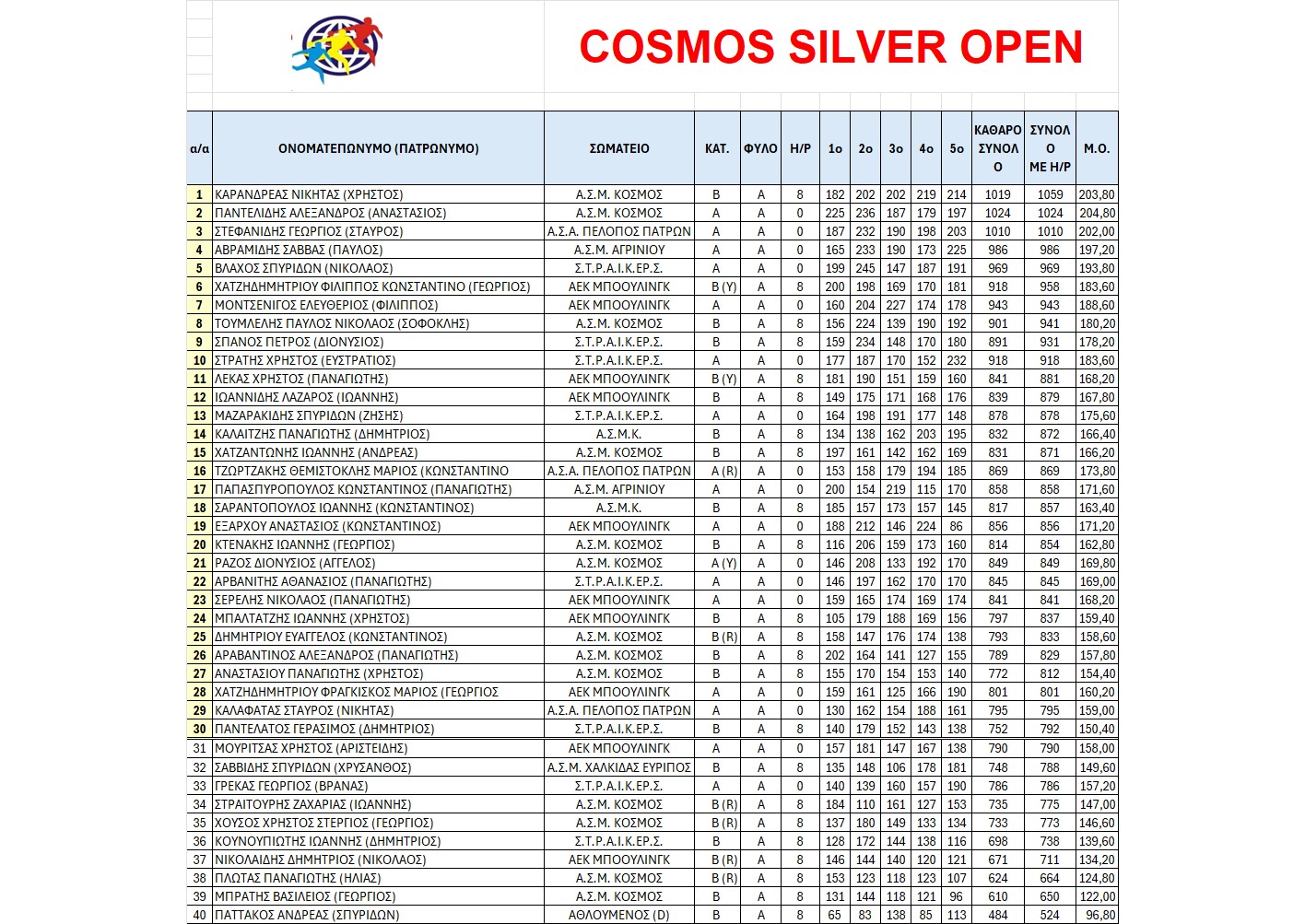 Α.Σ.Μ Κόσμος Silver 4 Προκήρυξη Oil pattern Δηλώσεις Αποτελέσματα Group 1 Αθλητών Αθλητριών Group 2 Αθλητών Αθλητριών Group 3 Αθλητών Αθλητριών Group 4 Συνολικά Προκριματικά Αθλητών Αθλητριών Τελικά Αθλητών Τελικά Αθλητριών